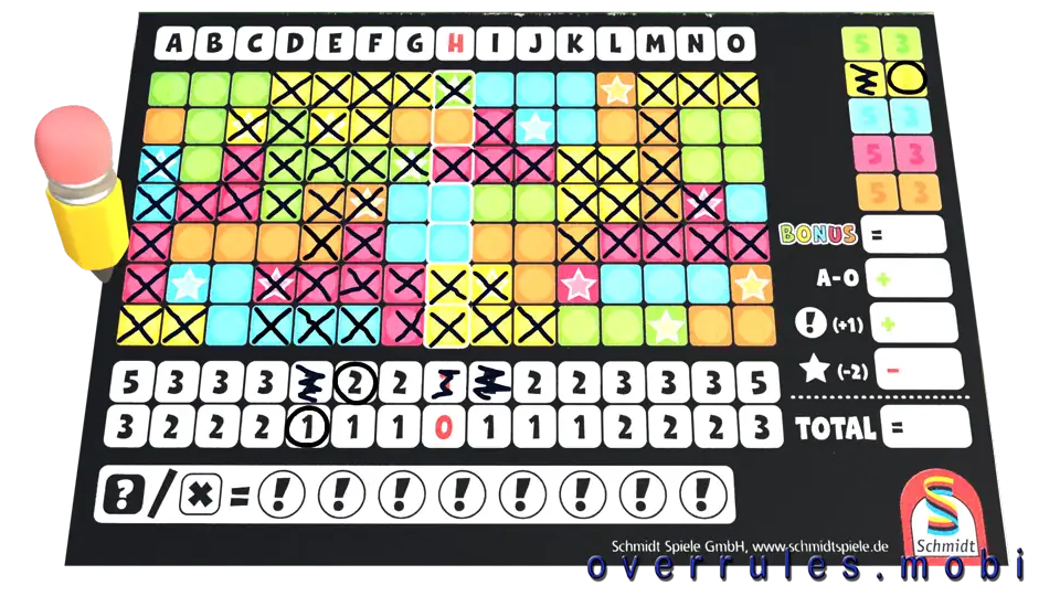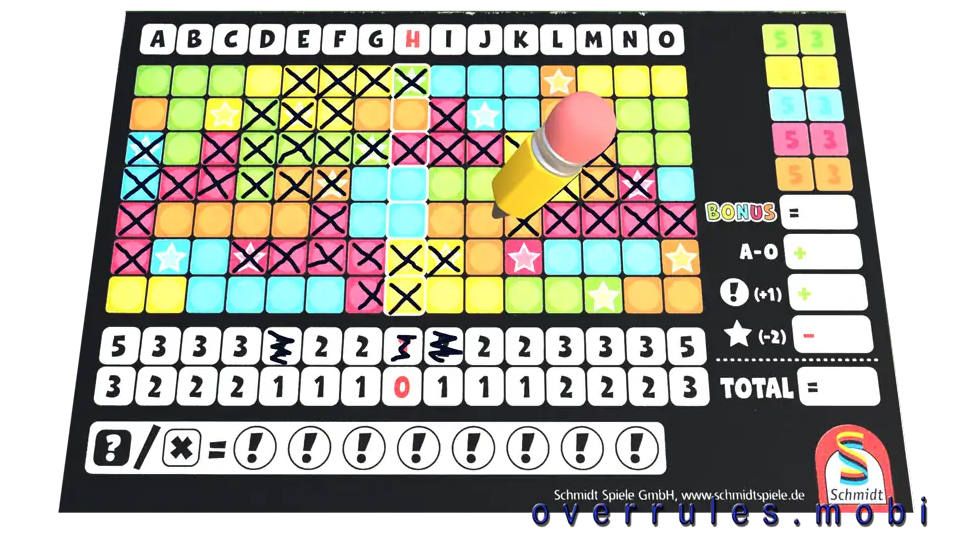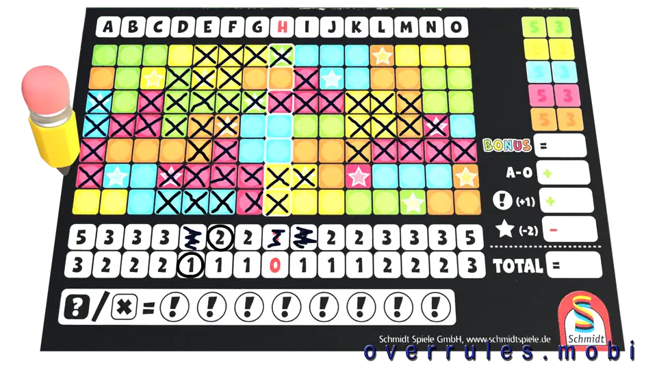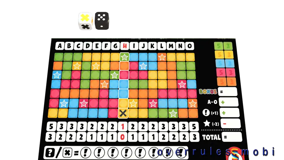 Vyvolávací a otazníkové znaménka – divocí žolíci!Znamenají libovolnou barvu/číslo na té samé kostceŠkrtněte za každou použitou žolíkovou kostkuvyvolávací znaménko na vašem blokuPozor: Nevyužitá vyvolávací znaménka přinášejí extra body