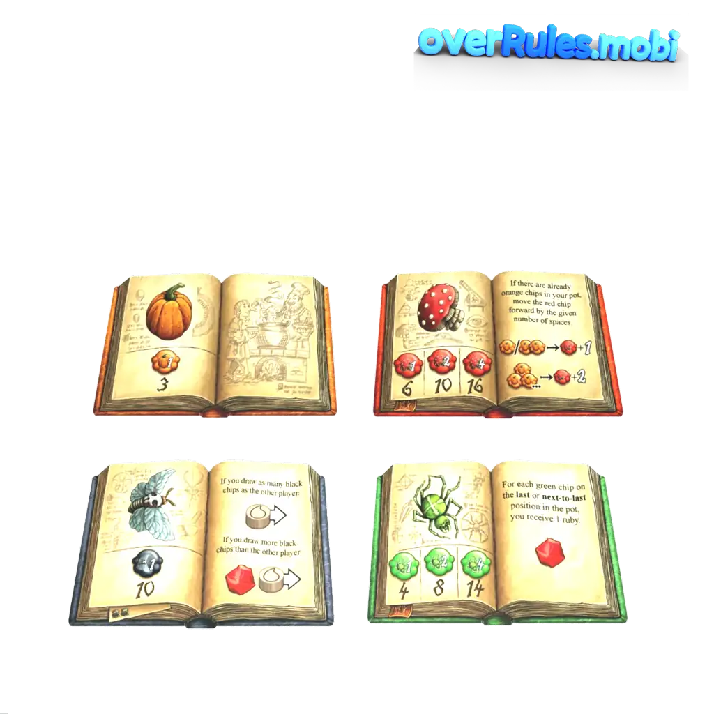 対応する本がゲームに登場したときのみ例えば、黄色の本はラウンド2からゲームに登場しますルビー:スコアリングフィールドにルビーがあるプレイヤーは1つのルビーを取得します。![Animatioin inside]()